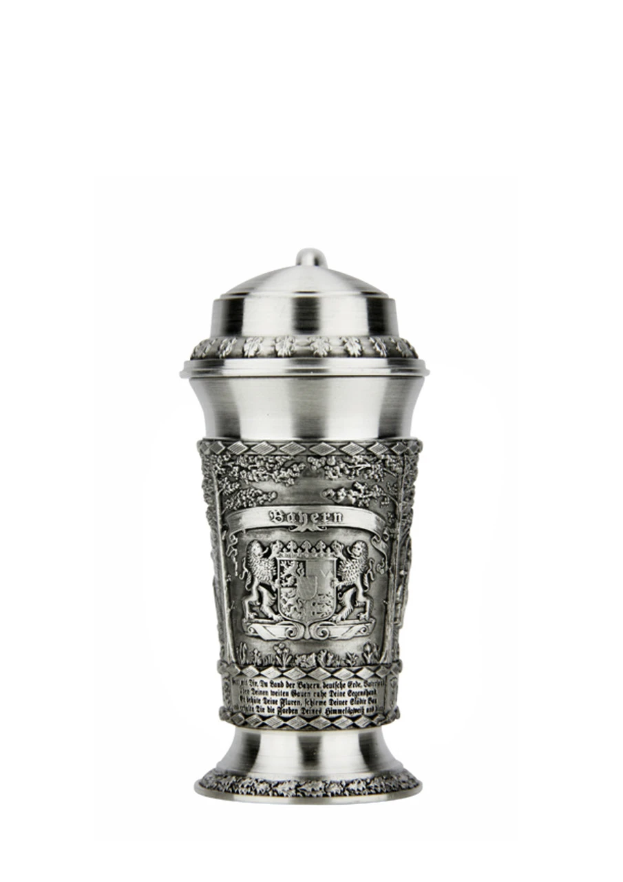 The first two stanzas of the Bavarian National Hymn or Bayernhymne is shown incised in minute letters below the lion crest. Oak trees frame the scenes with Bavarian lozenge pattern and oak leaf border accents. Coat of arms encircle the base of this mini pewter stein.