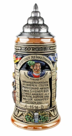 This stunning ceramic beer stein celebrates the 500 year anniversary (1516 – 2016) of the German purity law or Reinheitsgebot, which states only barley, hops and water can be used in beer.