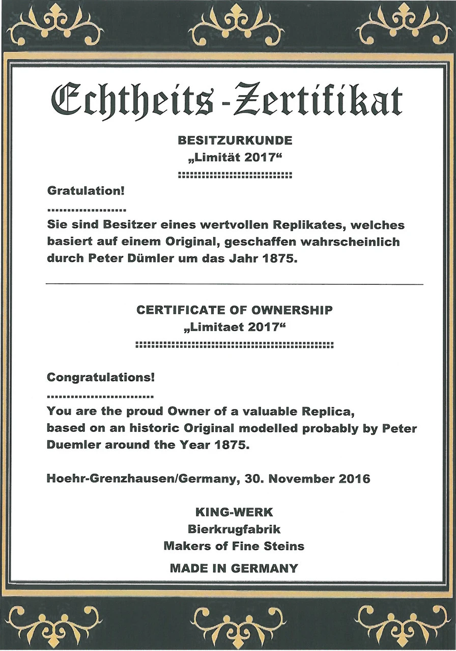 Traditions are rekindled with this new series. The beer steins are reproduced according to still existing records and using the original patterns of the models created by Peter Duemler (1860-1907), one of the best-known artists of his time, more than a century ago. Each beer stein of this series is exclusive and is manufactured only in a limited number, a rare piece for lovers of historic drinking vessels and collectors all over the world.