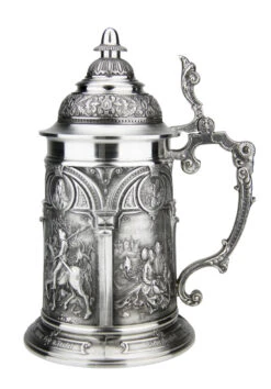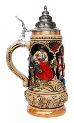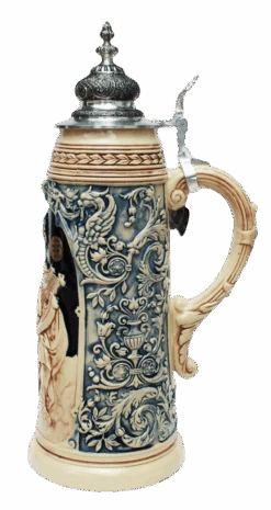 This beer stein features a pewter medallion of a hand painted Detuschland eagle crest reading “Old Germany” with 24K gold accents on the front. High relief alpine edelweiss flowers adorn both sides of this black & gray colored German stein with unique latticework (lozenge) decoration.