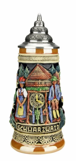 This 0.25 liter hand-painted beer stein shows a traditionally dressed cuckoo clock peddler and his wife standing in front of a larger than life cuckoo clock. Large pine trees tower over the couple. Vignettes of cities in the black forest are depicted on the sides including: Triberg, Titisee, Baden-Baden, Freiburg, Mummelsee and Freudenstadt. The stein reads “Schwarzwald” and honors the tradition of the cuckoo clock makers of the Black Forest. Pewter conical lid and cobalt blue background.